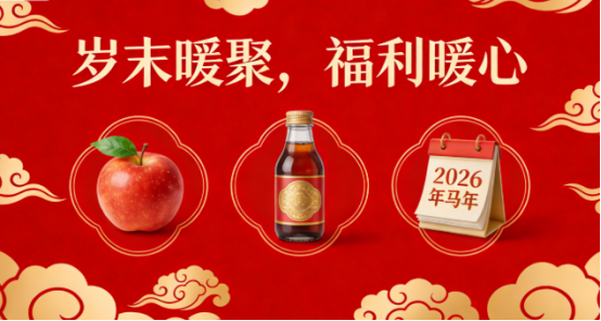 岁末送暖,情暖人心。在这满载期盼的日子里,公司始终铭记着每一位佳人的辛勤付出,特意精心筹备了暖心福利,为大家的新春增添一份欢喜与底气——清甜爽口的苹果,寓意着新一年平安顺遂、喜乐无忧;滋润可口的饮料,驱散一年的疲惫,留存满心的甘甜;还有印满美好期许的挂历,一页一页,承载着我们对2026马年的无限憧憬,记录下未来每一段并肩前行的时光。